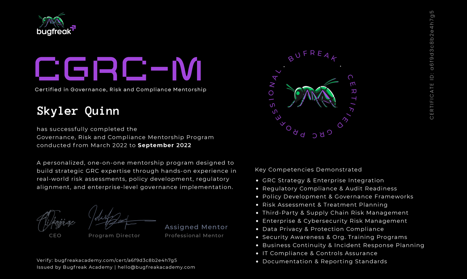 Mentorship Completion Certificate: Proof of hands-on learning and mentorship.